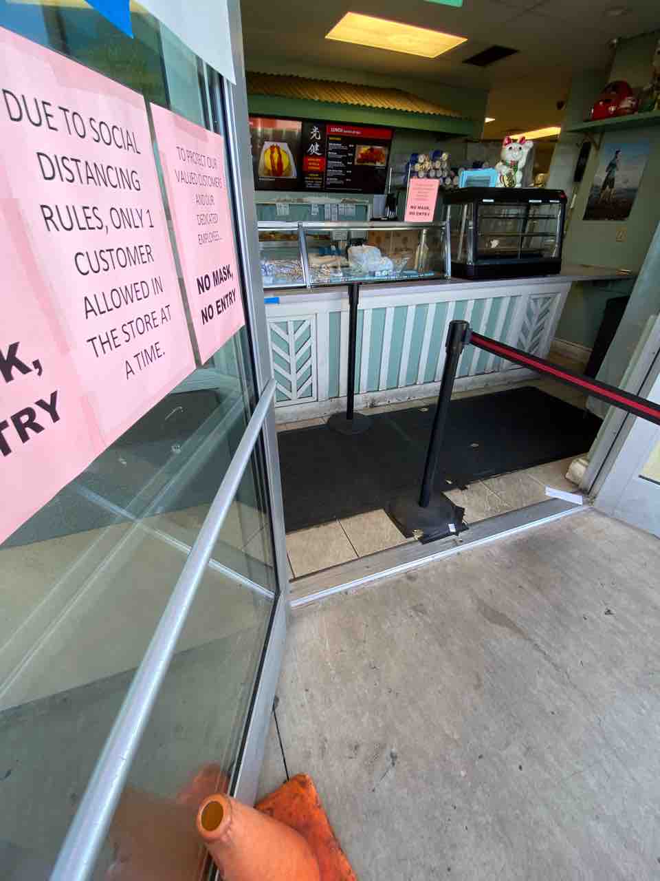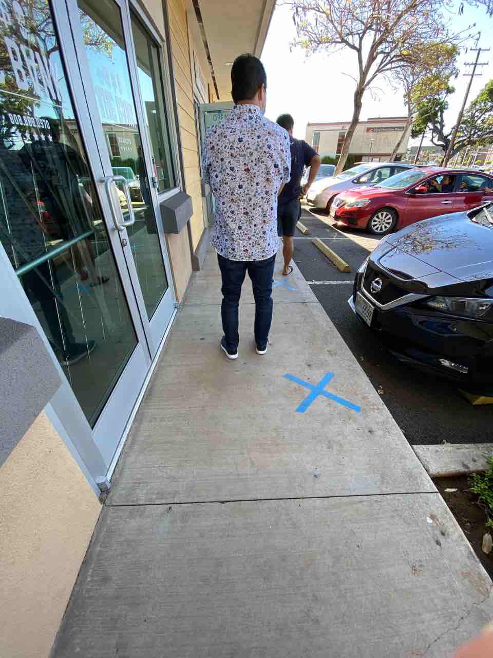 奥に見えるファーストハワイアンバンクでお金を下ろして、ソーシャルディスタンスを守りながら並びます。