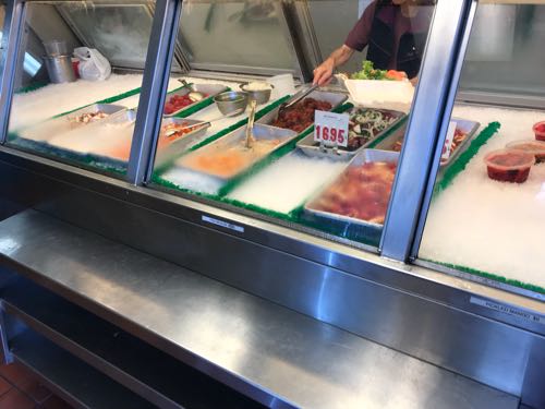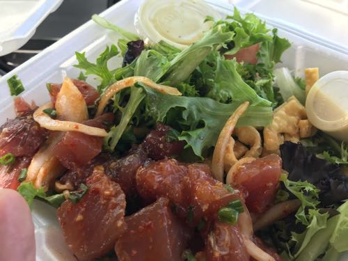 おめあての海苔ラップド・クラブミート・スタッフド・アヒを!それからもうひとつはヘルシーにポケサラダにしました。