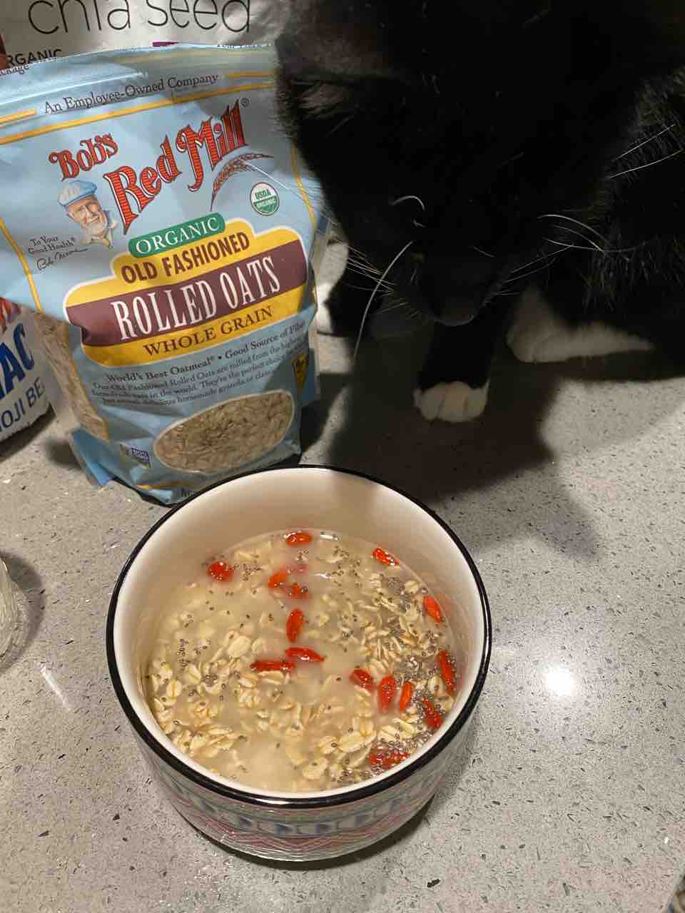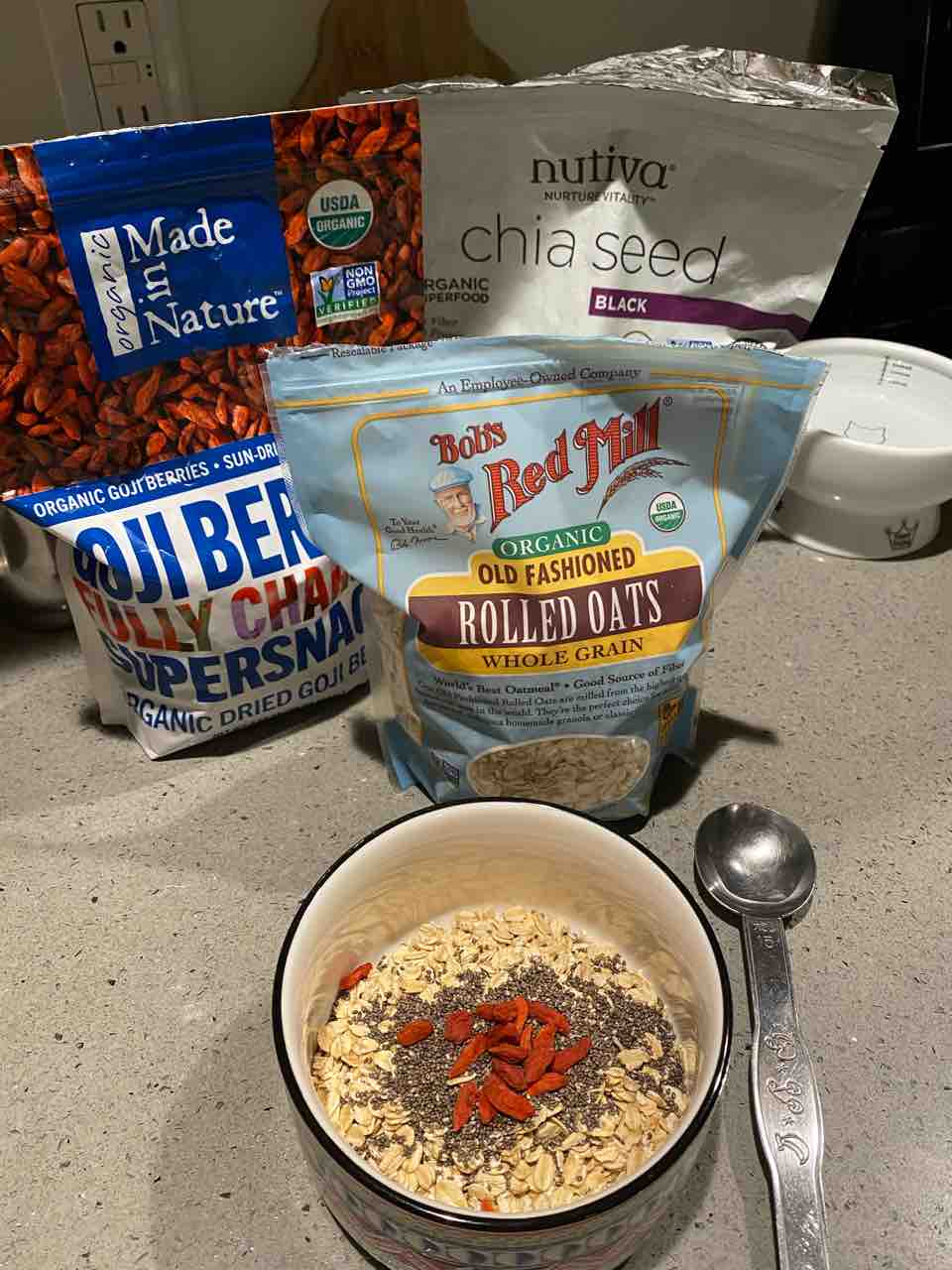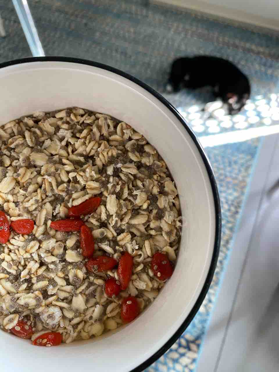 オーツを4oz、ゴジベリー(クコの実)、チアシード大さじ1を器に入れて〜。