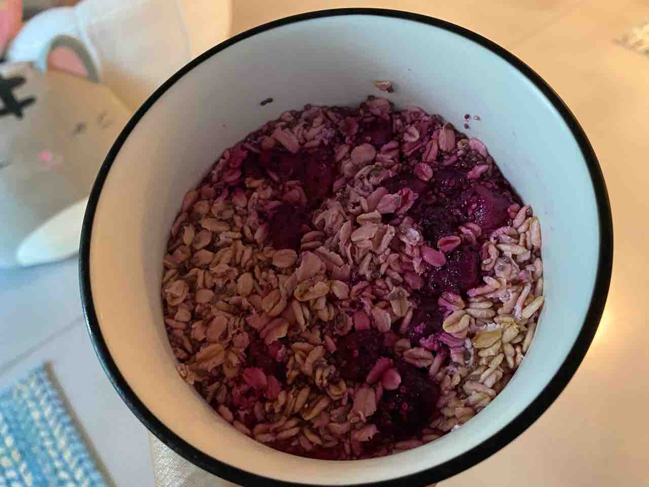 ここ最近のオーバーナイトオーツはドラゴンフルーツ入り。オートミール1/2カップ(48g)、ドラゴンフルーツ70g、チアシード大さじ1!