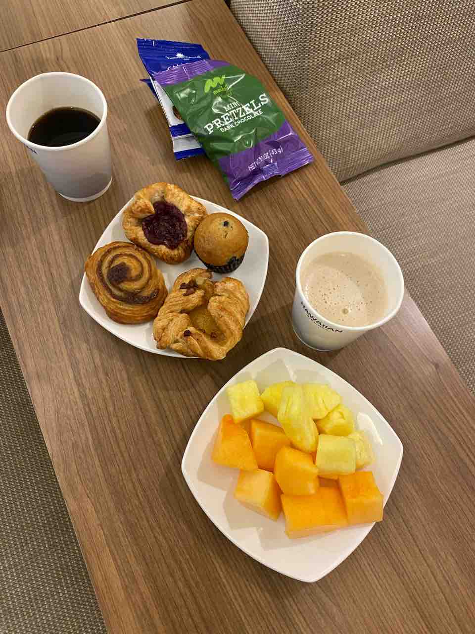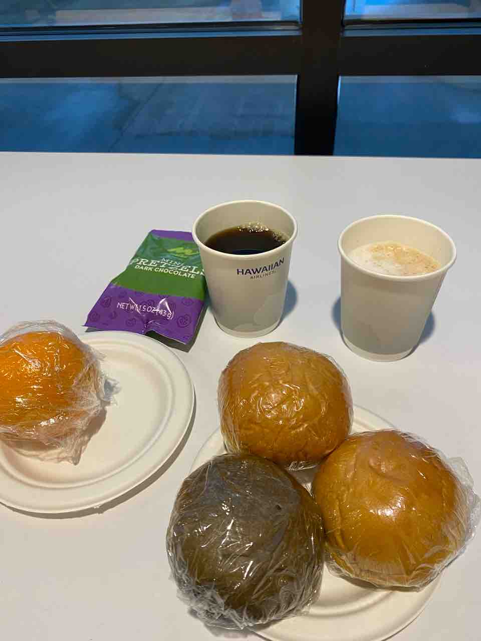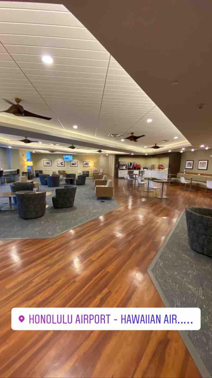 ホノルル空港(ダニエルKイノウエ国際空港)の、ハワイアン航空のラウンジ、プルメリアラウンジにやってきました!今からタヒチに行くのです〜!