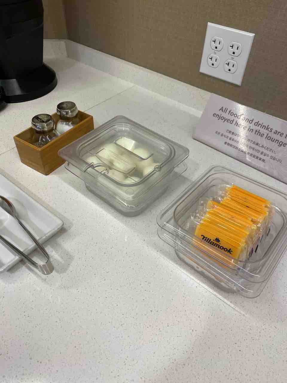今更ですが、10月末のプルメリアラウンジ訪問記録!朝のプルメリアラウンジ。ご飯の種類は結構少なくてしょぼめ〜🥹