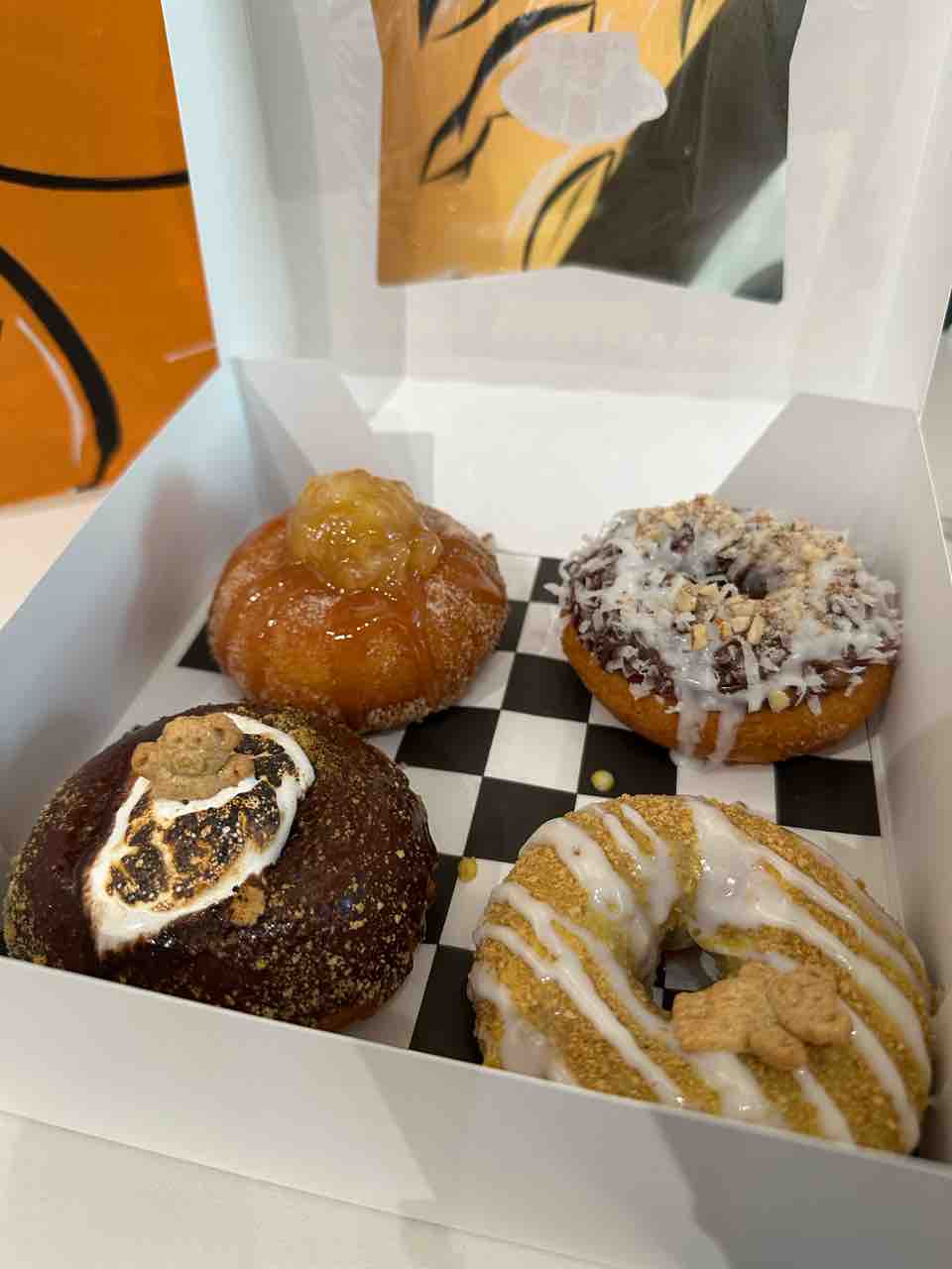 ドーナツの説明を読みつつ、マークしていくよ!ちなみに日本語もありました😊4つだけ買おうと思ってたけど、ハーフダズン(6個)買うとちょっと安くなるので、ついつい。ドーナツのハーフダズンの罠!