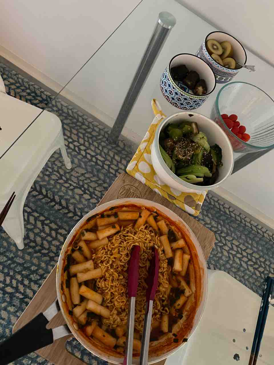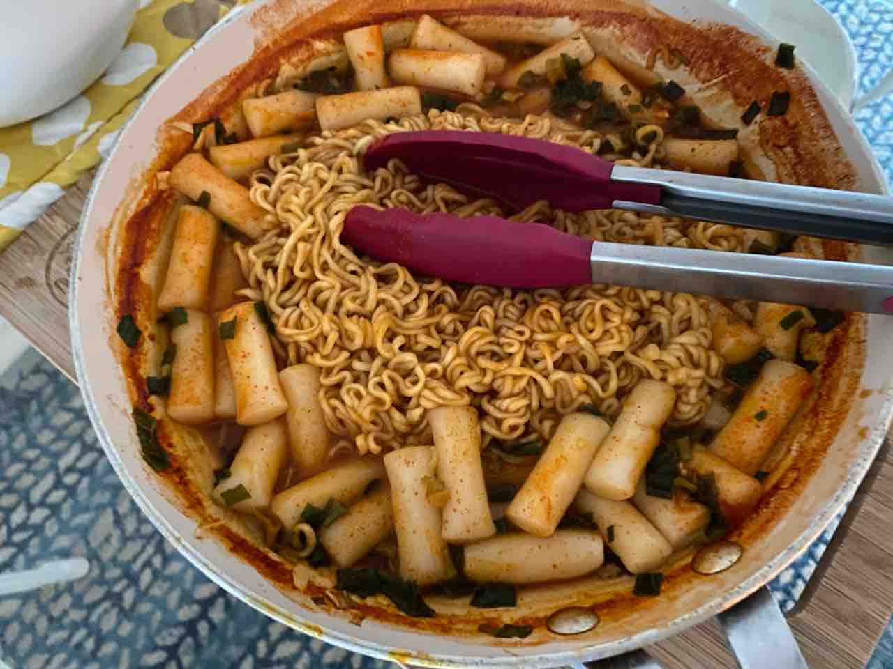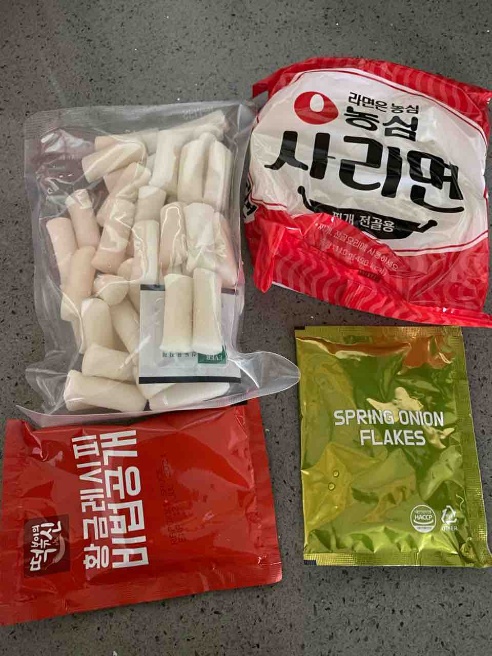 1セットはこんな感じで、インスタントラーメン、もち、ソース、グリーンオニオンフレーク。