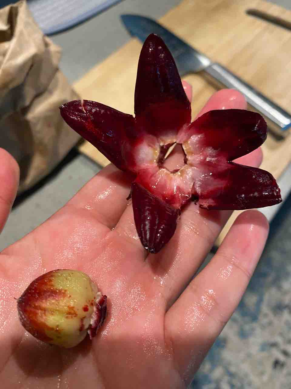 真ん中の種(?)の部分は食べれないみたいなので取り外して花の部分を齧ってみる。