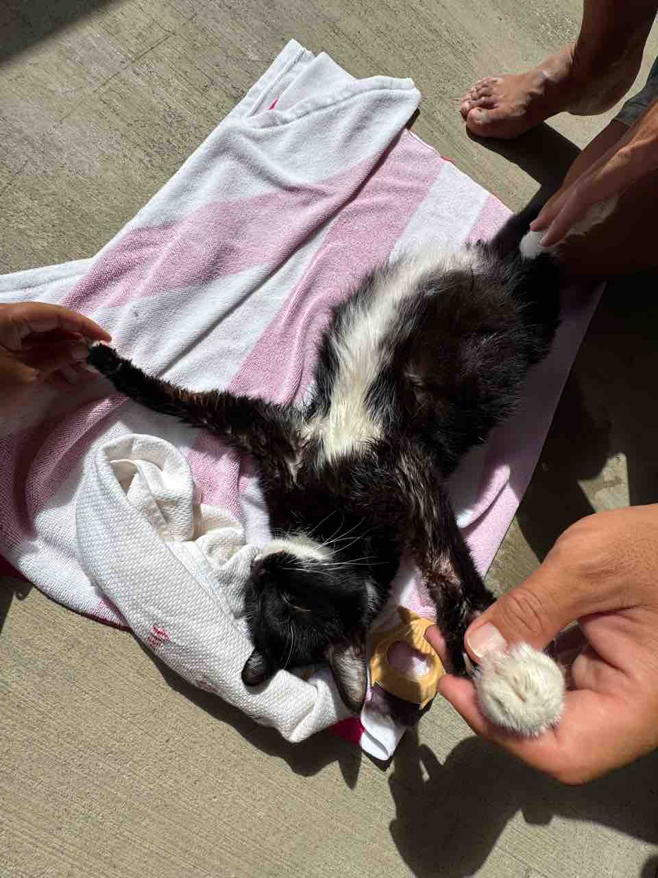 弱った3本足ではうまくバランスが取れないので、横から支えてあげる。