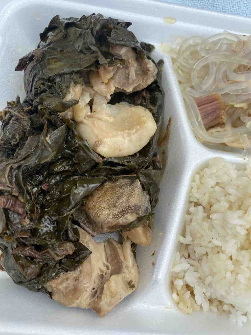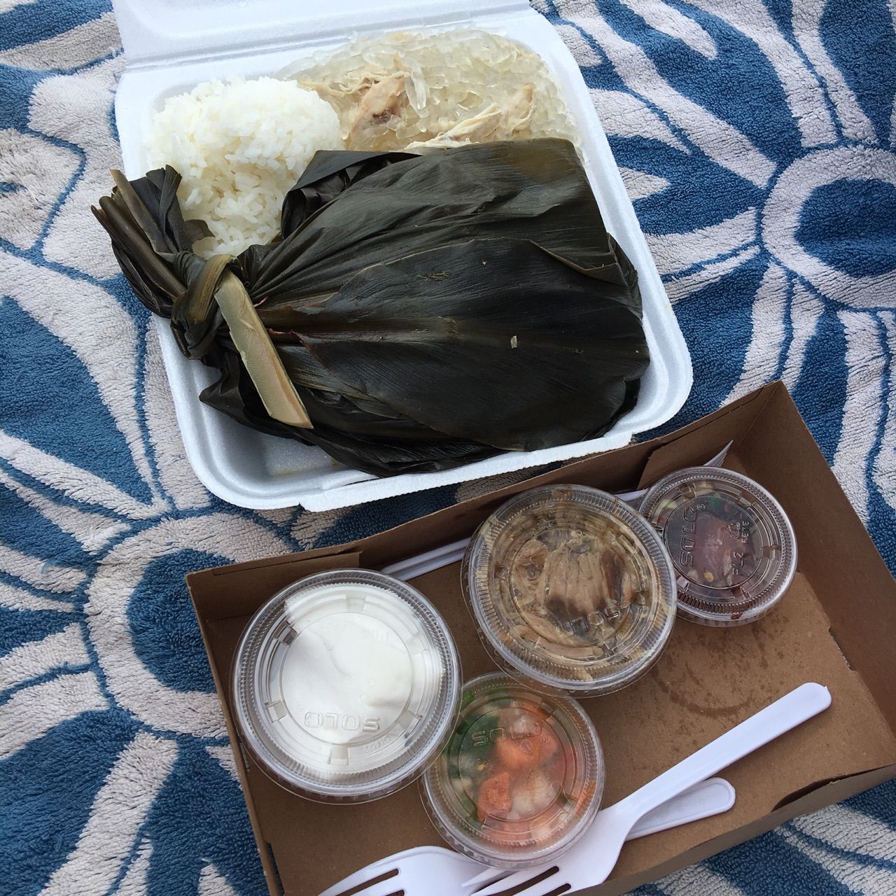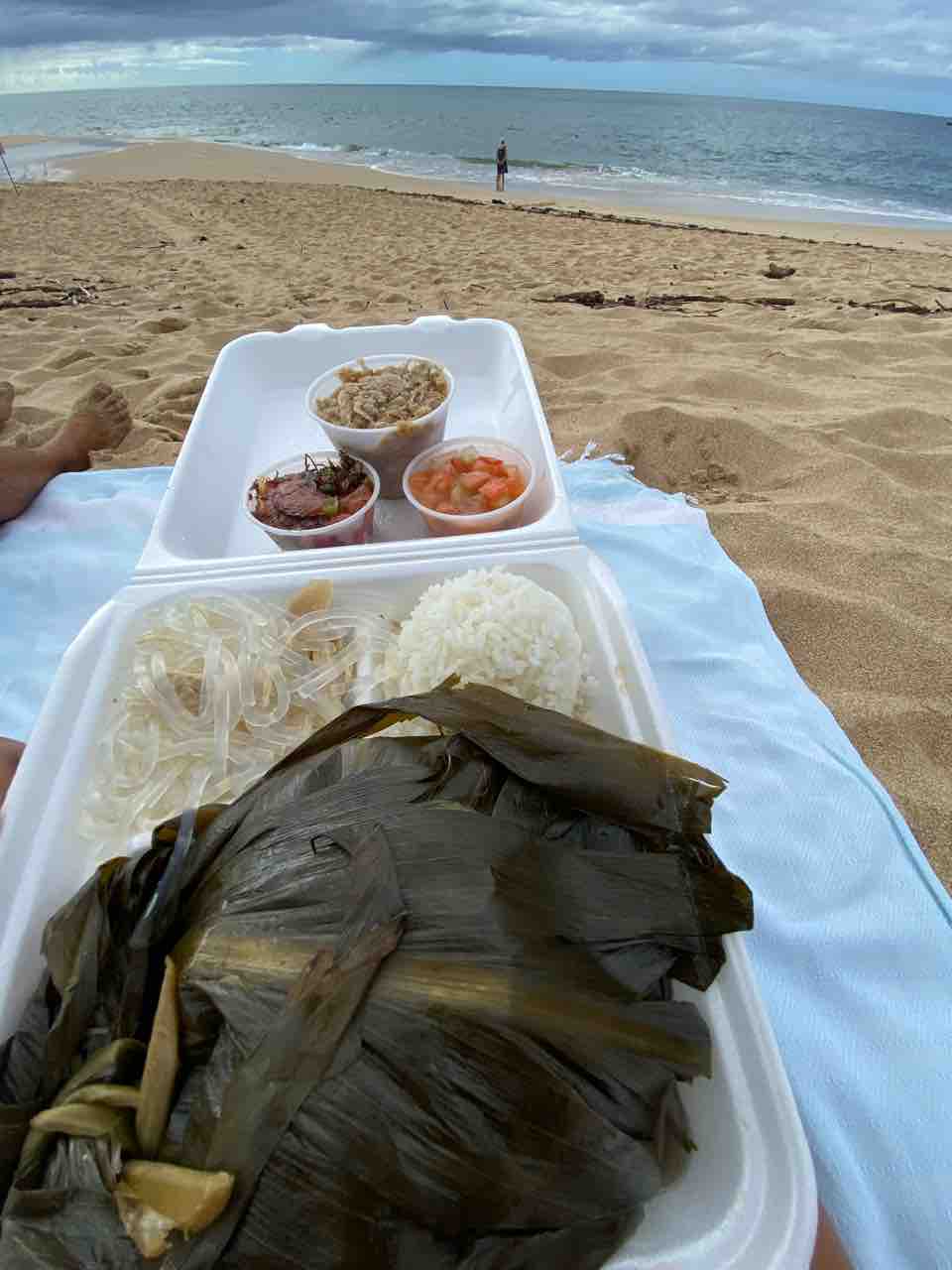 ごはん、ラウラウ、ロングライス(春雨みたいなやつ)、ポケ、ロミロミサーモン、カルーアピッグ、ハウピア!