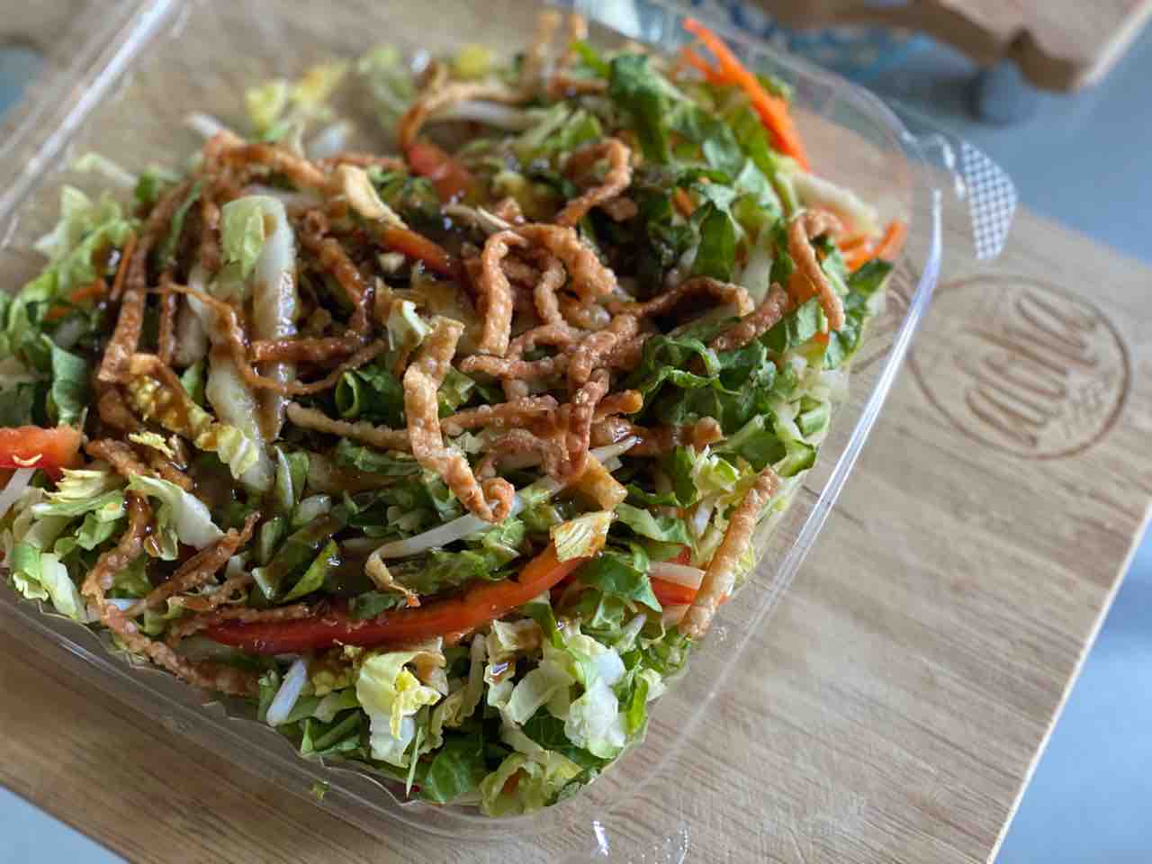 サラダはとってもボリューミーで食べても食べてもなくならない。上に載ってるクリスピーワンタン(?)が美味しい。