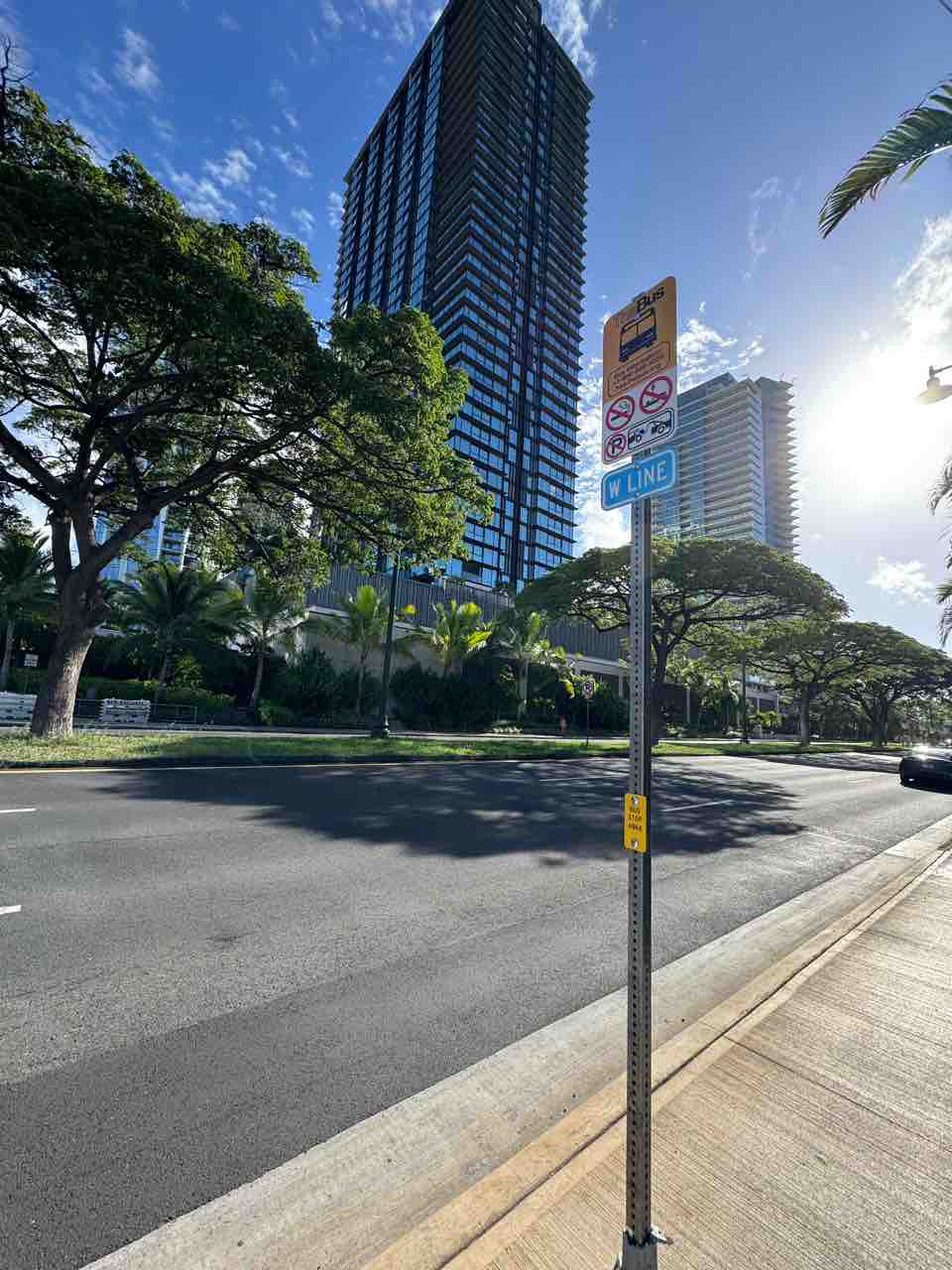 ワード(カカアコ)のWライン用バスストップは歩道橋の入り口にあります。便利。