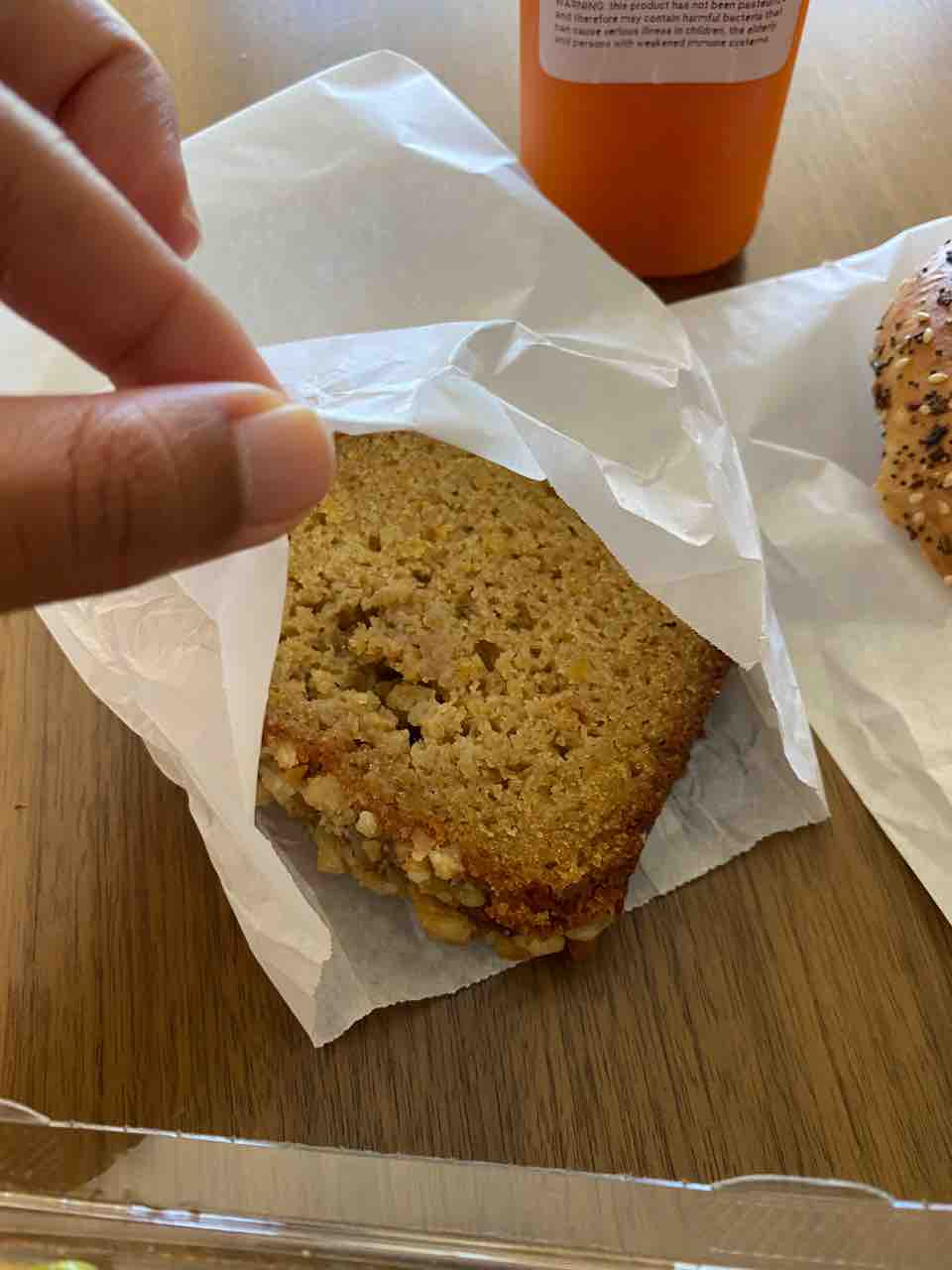 冷蔵コーナーから蕎麦サラダ、スモークサーモン、コールドプレスジュースを持ってレジに行ったら、サーモンにはベーグルがつくとのこと!