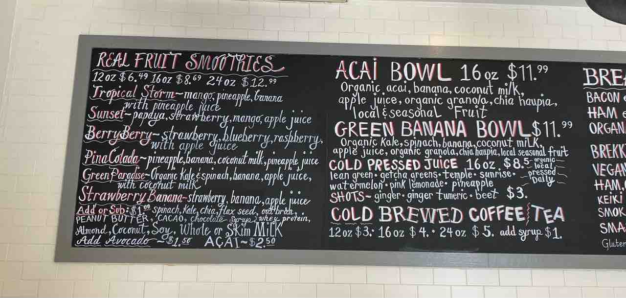 スムージーやアサイーボウルのメニューなど。