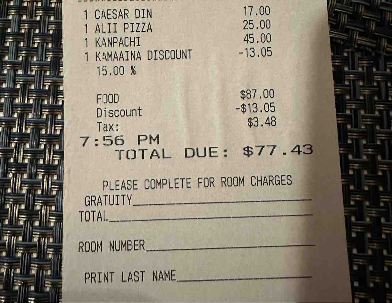 こちらお値段です。カマアイナはハワイ州民割引で15%オフ。