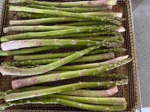 エアフライヤーに並べて、アボカドオイルスプレーを吹きかけてピンクヒマラヤンソルトをパラパラ。